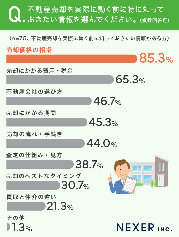 最も多かったのは「売却価格の相場」で85.3%と圧倒的な支持を集めました。次いで「売却にかかる費用・税金」が65.3%、続いて「不動産会社の選び方」が46.7%という結果となりました。
